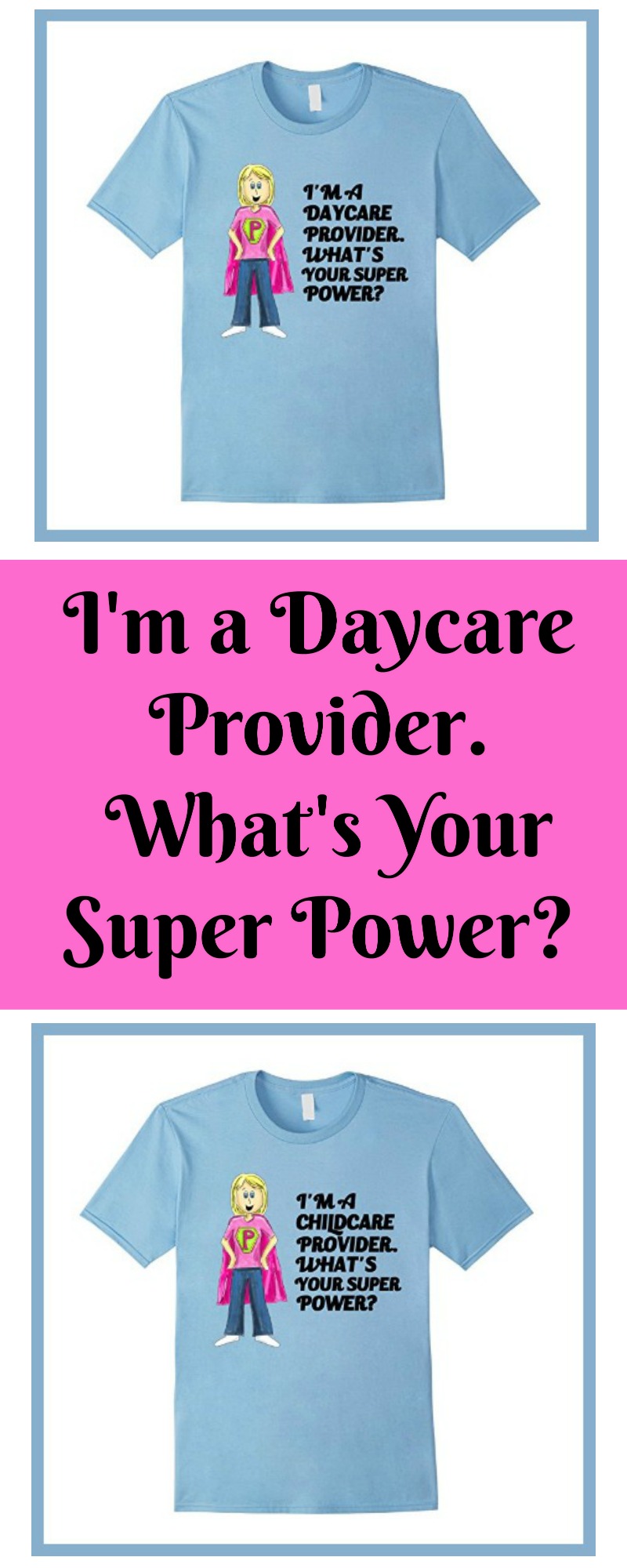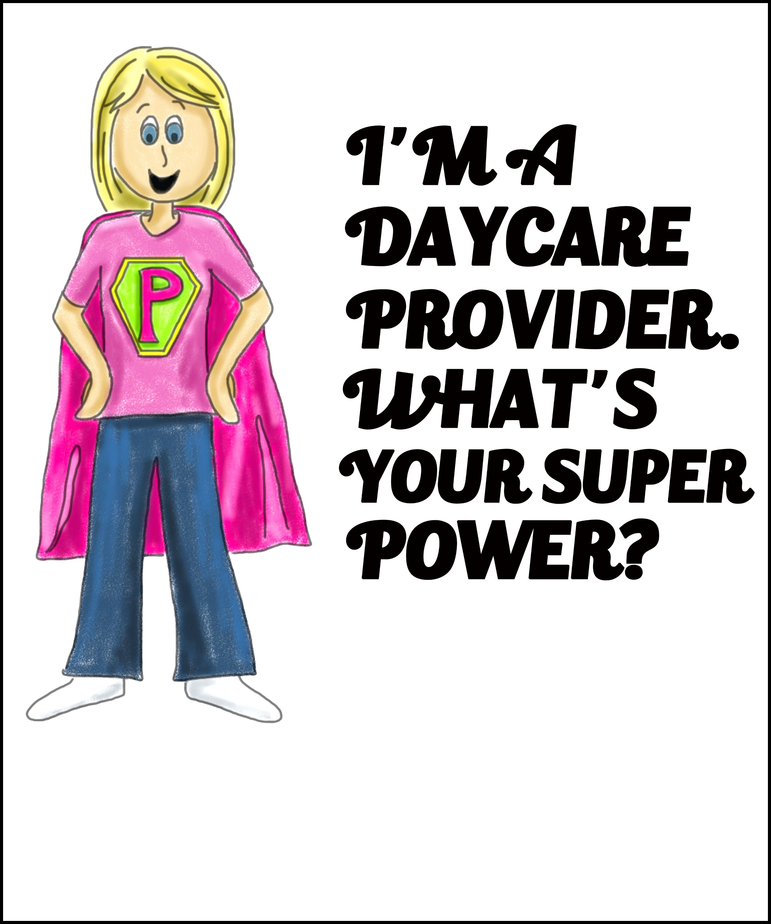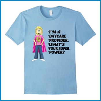 People often say, "How do you do it?" when they find out I take care of twelve kids per day. I should answer with, "I have Super Powers!" This shirt is available for the Daycare Provider and the Childcare Provider.