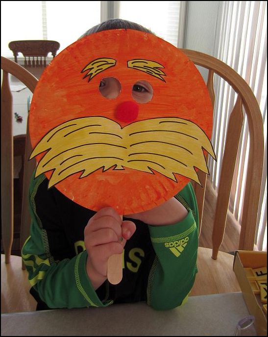 Print "The Lorax" mask stencil on white cardstock paper. Paint the paper plate orange. Let dry.