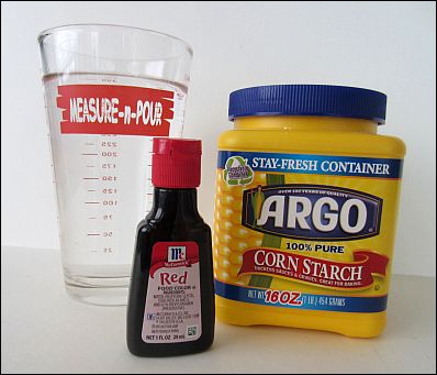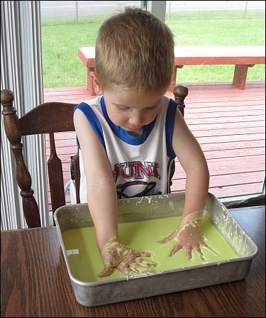 Mix the ingredients thoroughly and pour into an 8x10 cake pan. Let the kids play. Show them the difference between laying your hand flat and "slapping" the oobleck, compared to slowly lowering your hand into the oobleck. Is it a liquid or is it a solid?