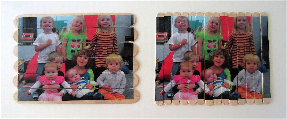 Place craft sticks side-by-side to reach the size of the photo. For the younger kids, I used 6 large craft sticks and laid them horizontally. For the older kids, I used 14 small craft sticks laid vertically and trimmed the edge of the picture a bit.