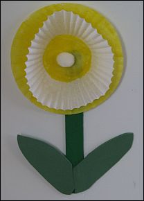 Using the hot glue gun, glue the cupcake liners to the top of the tongue depressor. Glue the pom pom into the center of the top cupcake liner. Glue the leaf shapes onto the bottom of the tongue depressor.
