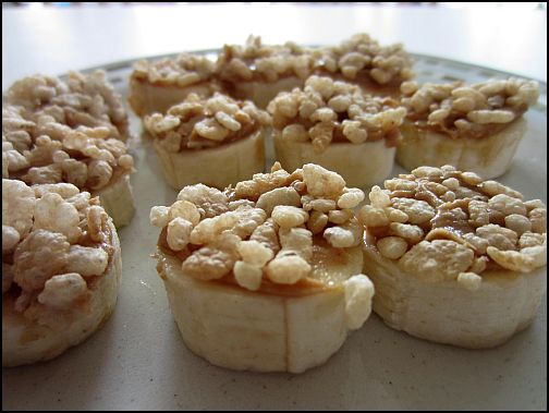 Top the bananas with peanut butter. The secret is that you can't try to spread the peanut butter. Bananas get slippery as soon as you touch them with anything. Use the knife to "push" the peanut butter onto the banana. Place some Rice Krispies in a shallow bowl. Dip the peanut butter covered bananas into the Rice Krispies.