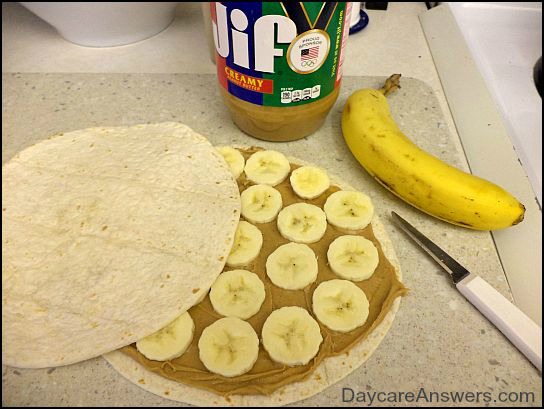 Spread a thin layer of peanut butter on one side of each tortilla. (This will prevent the quesadillas from slipping apart when the children eat them.) Cover one tortilla with banana "coins". Top with the second tortilla, peanut butter side down. Cut into pizza slices and serve.