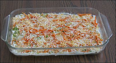 4. In a small mixing bowl, combine cream cheese, mayonnaise, and dry Ranch dressing. Spread the mixture over the cooled crust. Arrange broccoli, cauliflower, shredded carrots, and Cheddar cheese over the cream cheese layer. Chill for one hour, slice and serve.