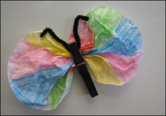 Lay the decorated coffee filter on a flat surface. Beginning in the middle, scrunch the coffee filter, pulling from top and bottom. Clip with the clothespin to form the butterfly's wings and body.