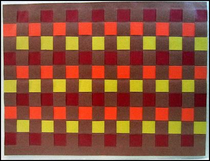 Cut strips of yellow, red and orange construction paper 3/4" x 12". Weave the strips of paper in and out of the slits in the brown paper. Start a strip over, then under, over, then under. The next strip should start under, then over, under, then over. As you finish weaving a strip, push it as close to the previous strip as you can. Glue the ends down.